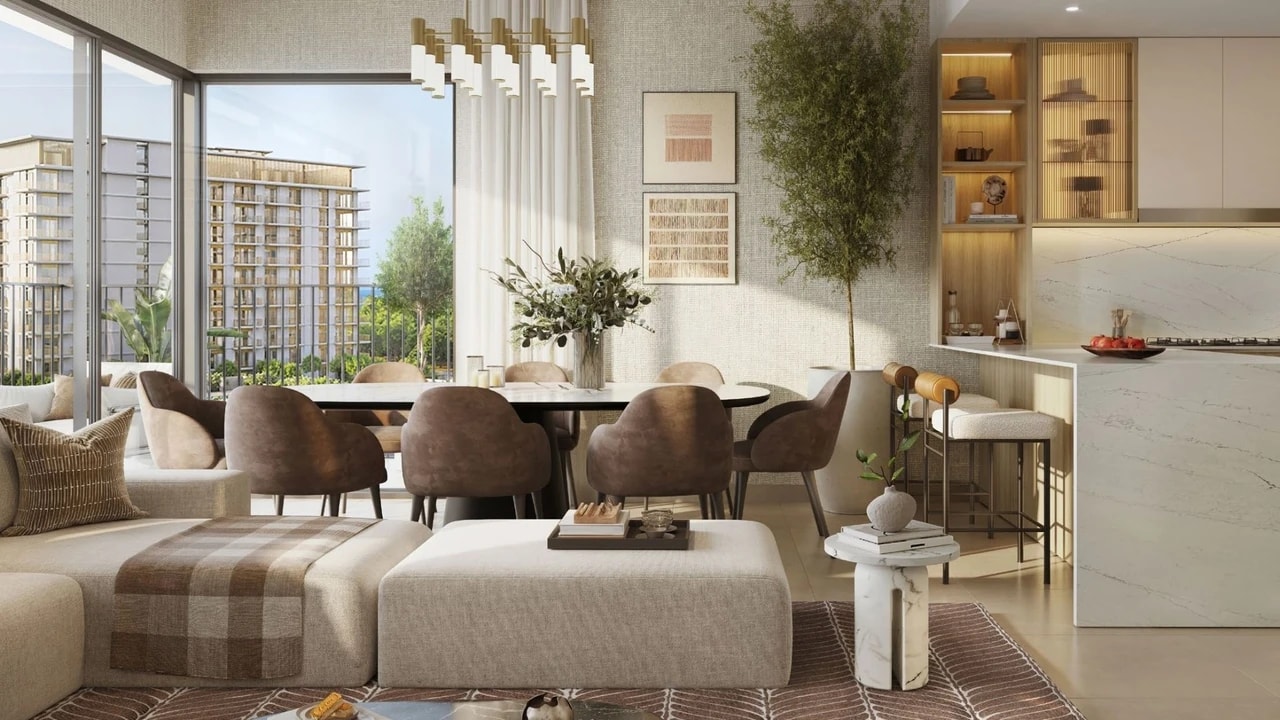 Golf Meadow homes for sale include a range of 1, 2, and 3-bedroom apartments as well as elegant 3-bedroom townhouses designed with modern aesthetics and functionality in mind. Each unit boasts floor-to-ceiling windows for panoramic golf and green views, spacious layouts, and premium finishes that elevate everyday living. The architectural style at Golf Meadow Dubai plays with light, space, and texture to create comfortable and inviting interiors that complement the scenic outdoors. Natural materials and soothing earthy palettes bring a sense of calm to each home’s design.